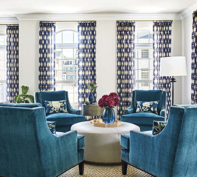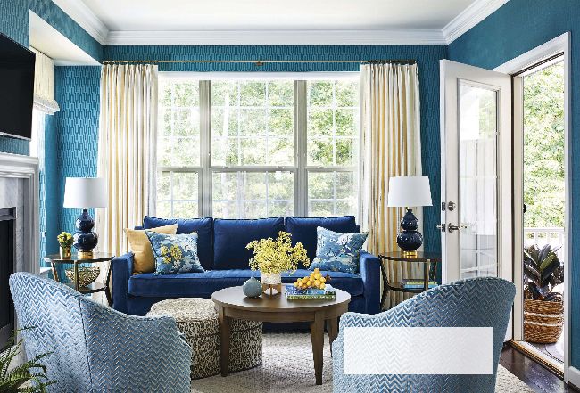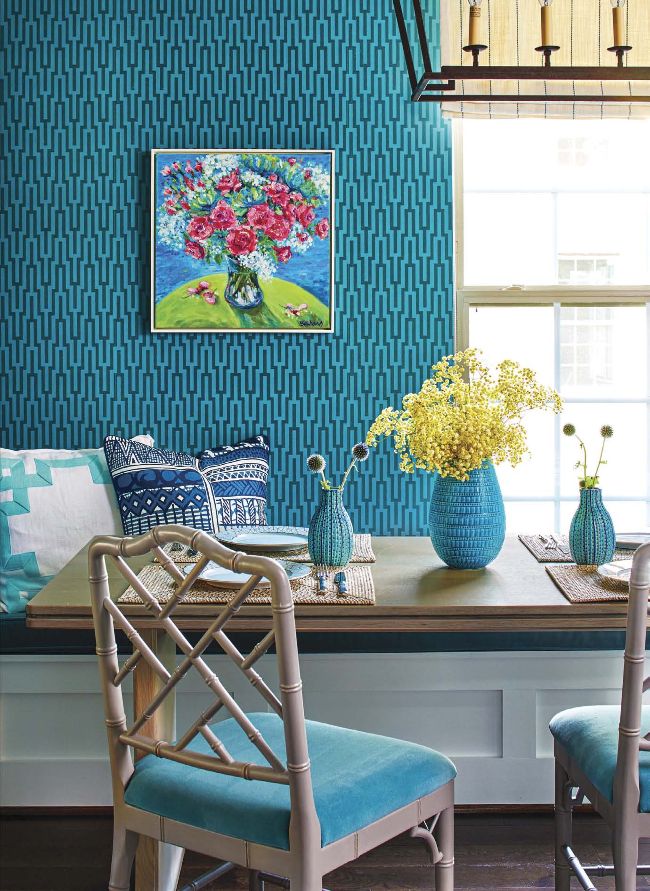 FLOW BLUE. “The family room is completely open to the breakfast room, so we used the same Schumacher wallcovering to connect the spaces: a deep Mediterranean teal with a geometric pattern and glass beads,” designer Pamela Harvey says. “We used a mix of blues and sand in this space, and each piece was carefully chosen for function. The pair of chairs both swivel, so they work well for TV watching and conversation in the family room or kitchen area. We had an ottoman custom made to nest inside the cocktail table.”