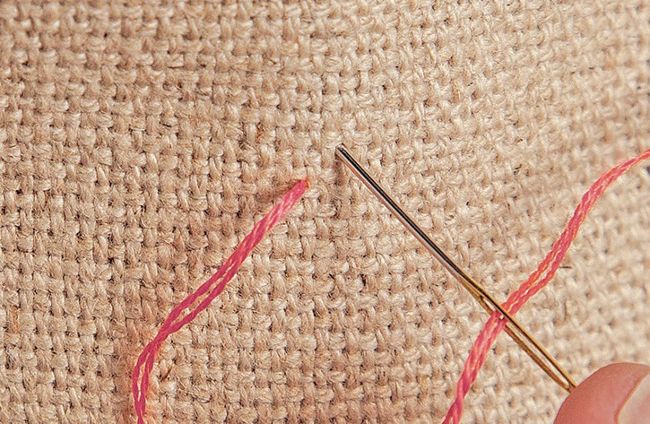 KNOT one end of your thread and take it down through the front of your fabric, 2cm from your starting point.Bring it back up to the front of the fabric to make your first stitch. Begin stitching your design, making sure you stitch over your starting thread with each stitch. Once you’re happy that your starting thread is secure, snip off the knot. To secure your thread when you’ve finished stitching, weave it through the back of your stitches.