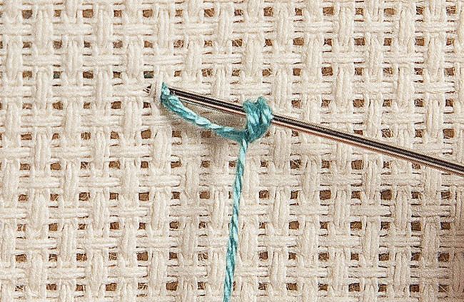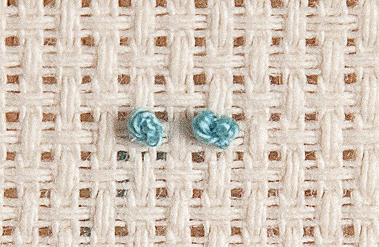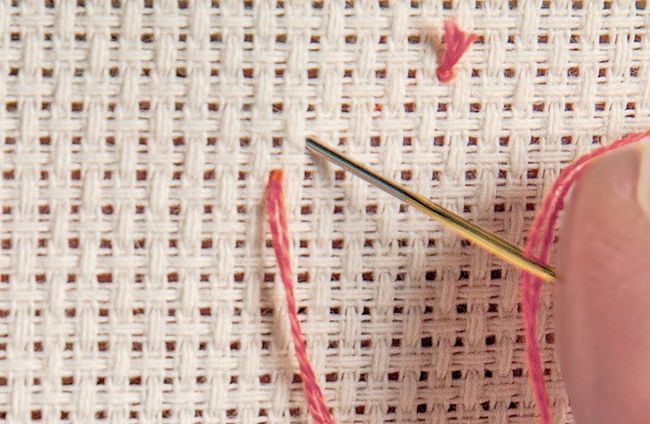 CUT a 40cm thread length, and thread your needle with two of the six strands. Knot one end and start with a waste knot (below). Make a diagonal half cross stitch across a single aida block.