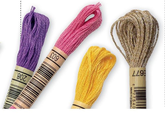 Embroidery thread is also called stranded cotton, or floss in the USA. Each thread length is made up of six strands of cotton twisted together. The chart key tells you how many strands you’ll need to stitch with. Stranded cotton comes in skeins of 8m, and in three main brands – DMC, Anchor and Madeira – all are divisible and colourfast to 95 degrees.