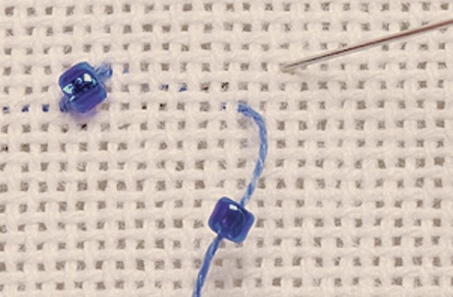 TO attach beads, you’ll need a thin, flexible beading needle. Thread with one strand of cotton. Bring your needle to the front of your design, thread on a bead and make a diagonal stitch to secure the bead. If you like, stitch through again for added security.