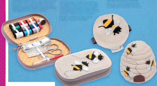 Firstly this cute sewing kit in a zip case. Made from 100% cotton fabric with appliqué bees. Each kit containts:
