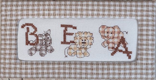 WHETHER you decide to work a single letter or a whole name, the cross stitch is worked the same way, starting in the centre of the fabric. All the cross stitch is worked in two strands of stranded cotton over two threads of Hardanger. Take care when following the chart and the key as the colours are similar, so it’s important not to get them mixed up. When you have finished all the cross stitch you can add the backstitch detail in one strand of dark brown. Use one strand of dark brown for the French knots on the giraffe.