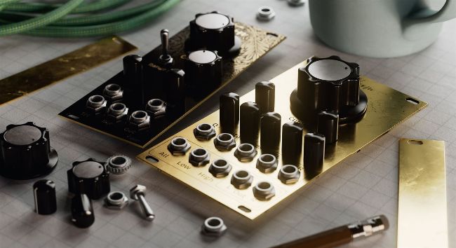 For this project you’ll need your geometry, a base material (in this case brass), and a sticker. You can make this anything you’d like, but for me, I’m choosing to do a floral pattern in black to suit the designs of the synthesiser modules I’m creating. Mine will be a single colour, where the pattern allows the brass to show through, but the technique works for solid stickers in full colour too.