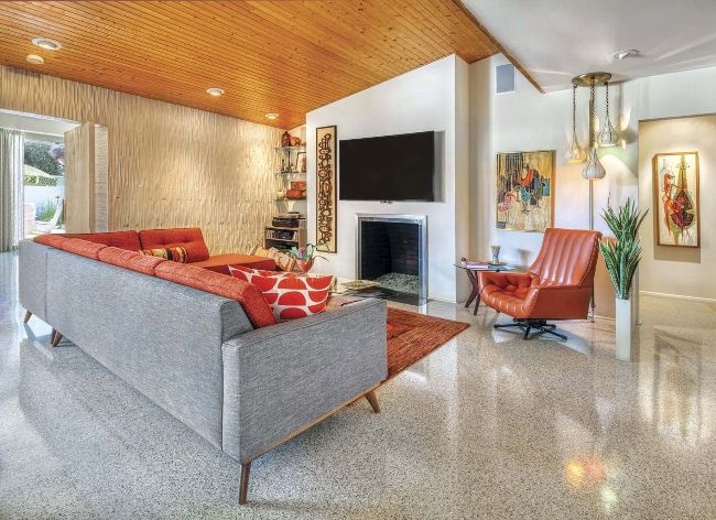 POURED TERRAZZO WAS USED FOR AN ERA-APPROPRIATE FLOORING THROUGHOUT THE MAIN AREAS OF THE HOME. A TWO-TONE CUSTOM SECTIONAL FROM WEST COAST MODERN IS ACCOMPANIED BY AN ORIGINAL 1950s RYA RUG AND A VINTAGE COFFEE TABLE. BEHIND THE COUCH IS A COZY READING AREA WITH A VINTAGE CHAIR AND A MID CENTURY LAMP WITH A CONNECTED TABLE, PLUS ANOTHER ORIGINAL RYA RUG.