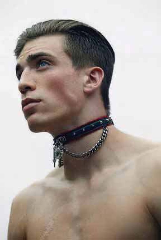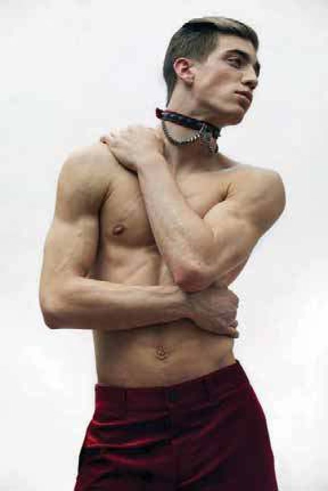Ben wears choker, price available on request, by Alexander McQueen, trousers, £850, by Dior Homme