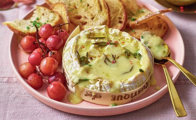 5 Warm the ciabatta in the oven for the last five minutes of cooking, then top the cheese with the grapes and serve with ciabatta slices on the side.