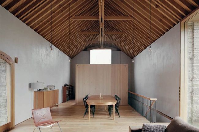 This property in Devon dates back to 1810. Separate from the other farm buildings, it had no road access or connection to services. Some walls had fallen down and others were overgrown, so the conversion has brought it back to life. The new house is designed within the reconstructed shell and is now hooked up to an air source heat pump. Douglas fir rafters and milled aluminium corrugated sheeting form the roof in order to reference traditional barns.
