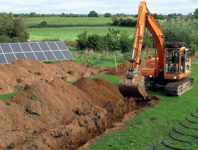 Trenches are dug to accept a horizontal slinky ground loop collector as part of an installation by Hero Renewables. The solar electric panels could help to offset some of the GSHP’s running costs