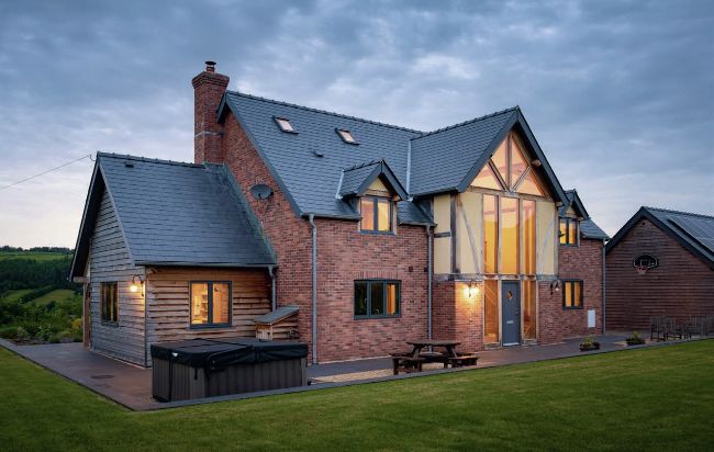 Delivered by Welsh Oak Frame, this handsome oak home features a varied external materials palette including timber weatherboarding, masonry and Tudor-style plaster with oak beams