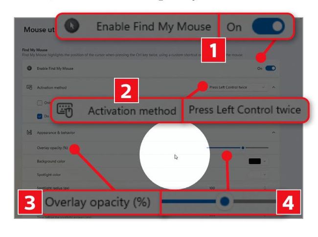 Launch PowerToys then click ‘Input/ Output’ on the left and select ‘Mouse utilities’. Now turn on ‘Enable Find My Mouse’ ( 1 in our screenshot below) and set your preferred ‘Activation method’ that turns on the tool 2 . Next click ‘Appearance & behavior’ and move ‘Overlay opacity’ 3 to set the transparency. Choose higher opacity when you need to spot the cursor quickly, such as on multiple monitors or when giving presentations. Here, we’ve set the opacity to 75 4 .