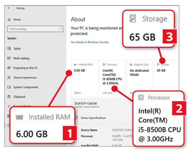 Make a note of your PC’s RAM, processor model and storage capacity