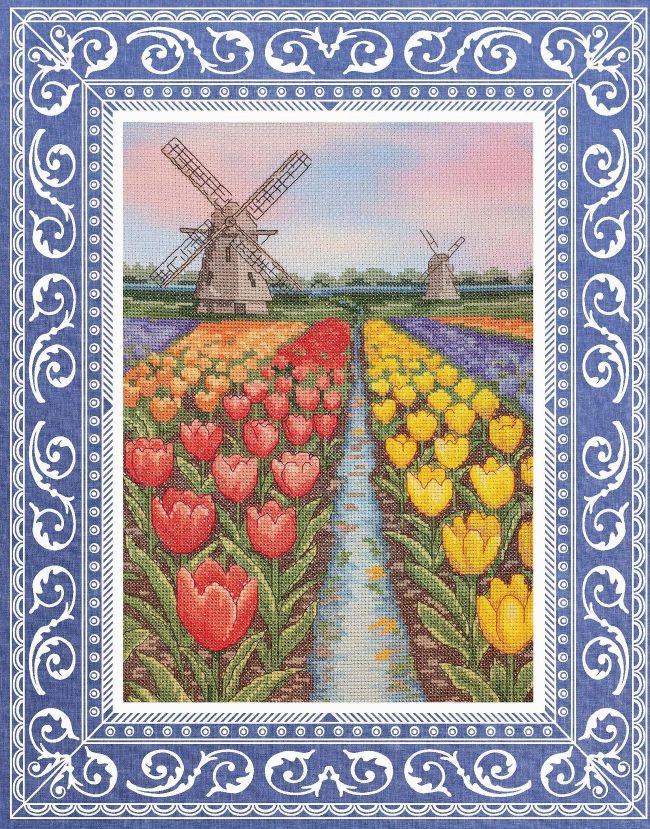 Fancy tripping through the tulips? Well, now you can, with our beautiful field of blooms, complete with windmills in the background. There’s a lot of dense stitching here, so take your time as you enjoy bringing it to life. Areas such as the background trees will come together quickly, as they are whole stitches only, with no backstitching to worry about. A floral scene that’s rewarding to complete!