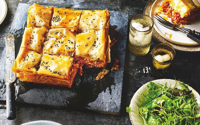 Savoury pork and fennel baklava with roasted tomatoes and feta, p70
