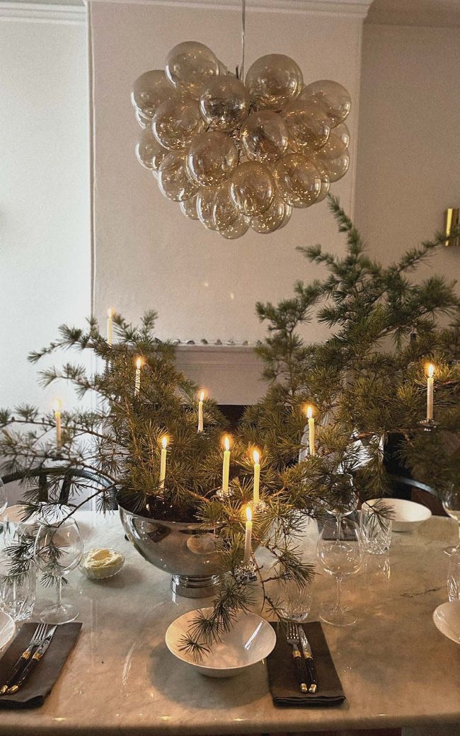 Pine tree clippings adorned with LED candles make for a festive and budget-friendly centrepiece.