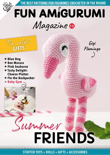 In this issue of Fun Crochet Magazine, we bring you a vibrant collection of handmade gifts and characters that will brighten this season of sunshine, adventure and playful moments. Feeling tropical? Gigi Flamingo and her friend the Pink Seahorse are a colorful, imaginative duo you’ll love to make. Crochet the blue dog, a cheerful make-believe friend, or create a soothing space for the littlest ones with the Baby Gym ‘By the Waterside’, where bees and butterflies dance and jingle above tiny hands. And meet Flo the Backpacker, a little globetrotter who’s trading wings for wanderlust. And much more! Whether you make one gift or the whole gang of Summer Friends, this issue is all about connection, celebration, and handmade happiness.