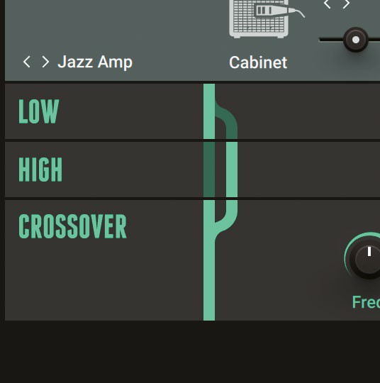 2 Let’s look at how Crossover works. Add it to the rack and you’ll see it has split the signal into Low and High channels, which we can treat independently. You could add different amps to each channel, or just use it for effects components.