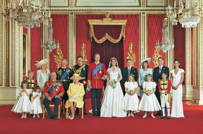 The newlyweds in Buckingham Palace’s magnificent Throne Room, surrounded by William’s father and stepmother Charles and Camilla, his brother Harry and grandparents the Queen and Duke of Edinburgh, Kate’s parents Michael and Carole Middleton, sister Pippa and brother James, and the bride’s young attendants