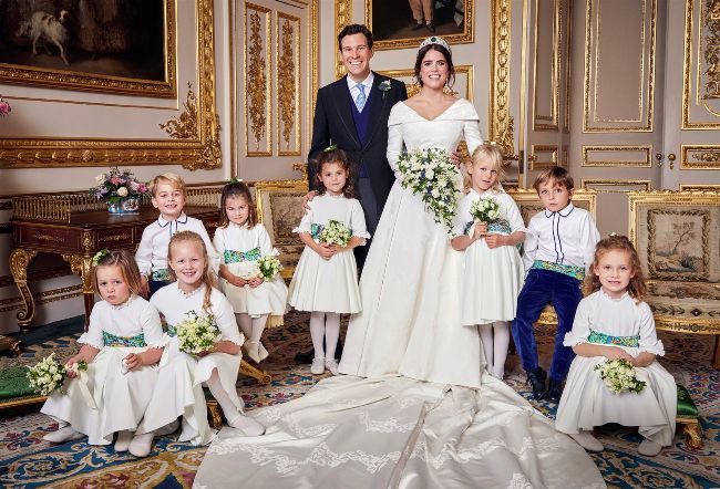 The couple with their attendants, including Prince George and Princess Charlotte and Robbie Williams’s daughter Theodore