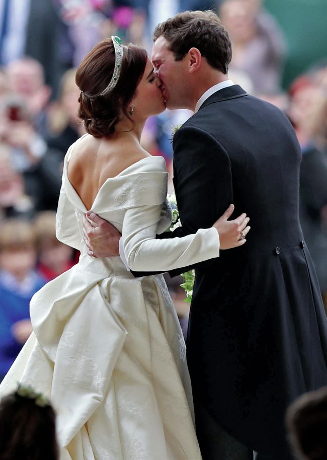 A kiss for the bride, in her lowbacked Peter Pilotto dress and emeraldstudded heirloom bandeau-style tiara borrowed from her grandmother Queen Elizabeth II
