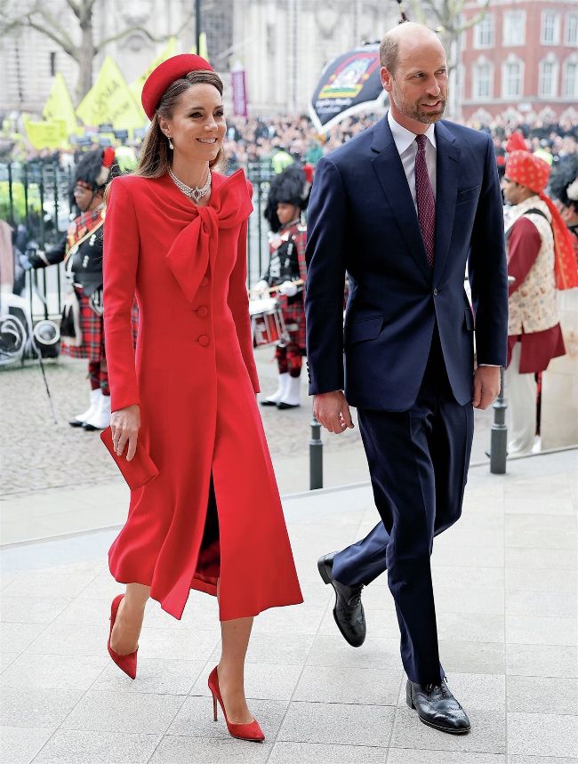 Wearing a striking scarlet Catherine Walker coat with a matching Gina Foster hat, Kate arrives at Westminster Abbey for the service with her husband the Prince