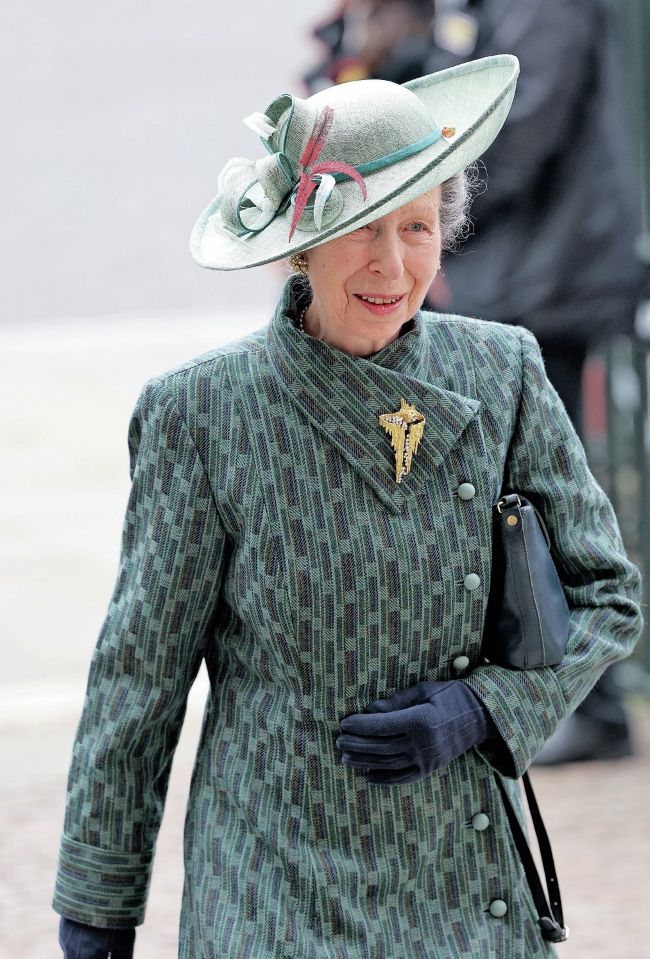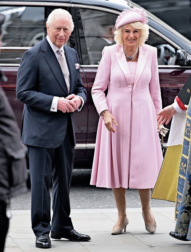 Guests at the service include the King and Queen (together left), Her Majesty wearing a pale pink coat dress by Fiona Clare with a matching hat by Philip Treacy;