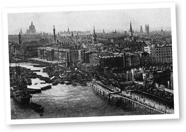 ON THE THAMES This 1894 view from the new Tower Bridge shows London as a bustling port