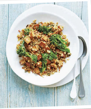 * 100g quinoa*200ml water ½ tsp salt*3 tbsp vegetable oil*200g smoked tofu, cut into 1cm cubes *1 garlic clove, thinly sliced *1 hot red chilli, deseeded and finely chopped*Thumbsized piece of fresh root ginger (about 20g), peeled and finely chopped*1 tbsp pumpkin seeds*1 tbsp sunflower seeds*150g tenderstem broccoli*3 tbsp soy sauce*2 tbsp toasted sesame oil