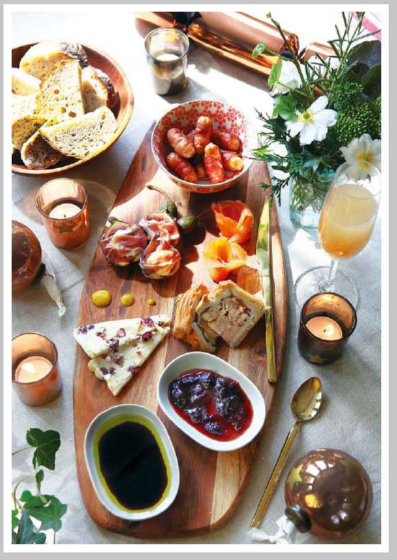 * 100g of pigs in blankets *2 figs * 2 tsps of soft goat’s cheese *2 rashers of Parma ham *sourdough bread, sliced * extra virgin olive oil *balsamic vinegar * flaked sea salt *4 slices of smoked salmon * 4 slices of cranberry and Wensleydale cheese *pork pie, sliced * cranberry sauce *english mustard