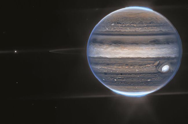 At the poles of the gas giant, the James Webb Space Telescope has captured high-altitude aurorae caused by the planet’s fluctuating magnetic field. The Great Red Spot of Jupiter appears bright white in this image due to the reflection of sunlight. Webb also captured faint rings and two of Jupiter’s moons, called Amalthea and Adrastea, seen as fuzzy dots in the back of the image.