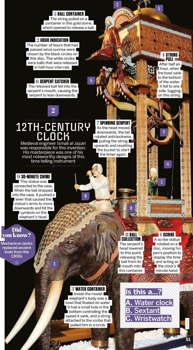 the movements of the Sun throughout the day casting shadows on different parts of the equipment. Their use can be traced back to ancient Egypt, and they were commonplace on church walls across the UK during medieval times. At the centre of its circular plate was a protruding style, called a gnomon. This is what blocked the sunlight to cast a shadow. Some of the earlier versions had marked lines dividing a curved plate into 12 segments. This signified the 12 hours of the day. The line that the point of the shadow reached indicated the hour of the day. However, because days were shorter in winter and longer in the summer, hours were different periods of time based on the season. They were called ‘seasonal hours’. Islamic scientists invented more accurate instruments that maintained equal hours throughout the year.