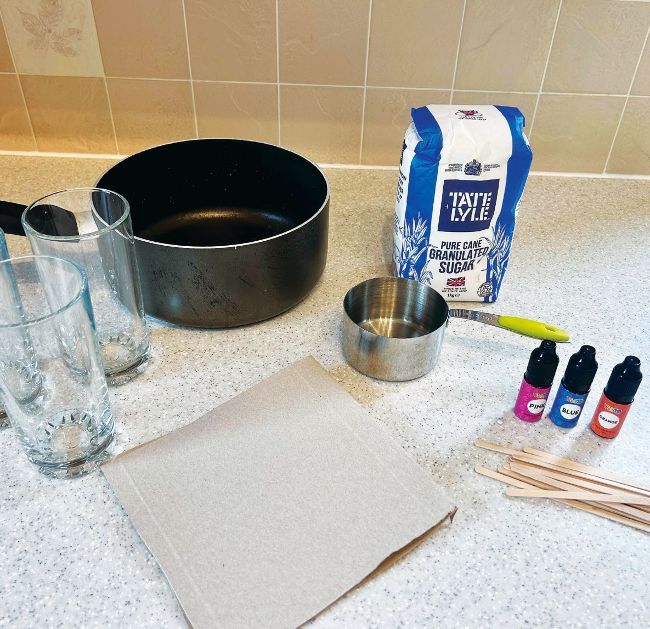 Make sure you have all of your materials before starting. Food colouring is optional to create vibrant results.