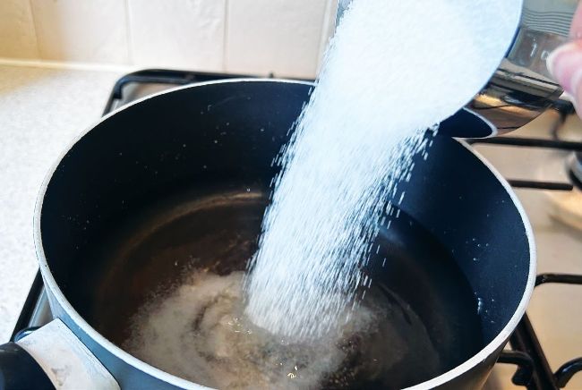 Pour your sugar and water into a pan. You will need three cups of sugar for every one cup of water.