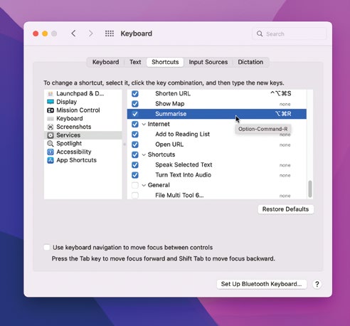 Start by going to System Preferences>Keyboard. Click on the ‘Shortcuts’ tab, then highlight ‘Services’ in the sidebar and make sure that the ‘Summarise’ feature is turned on (ticked).