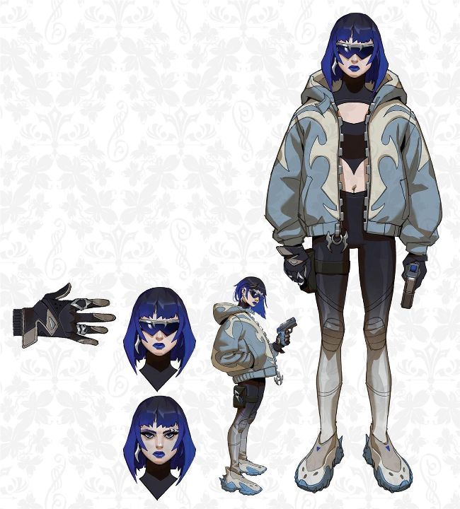 “This concept board presents a character design with various poses and close-ups. I played with the oversized jacket to create a strong silhouette, and hinted at her rebellious nature with electric colours.”