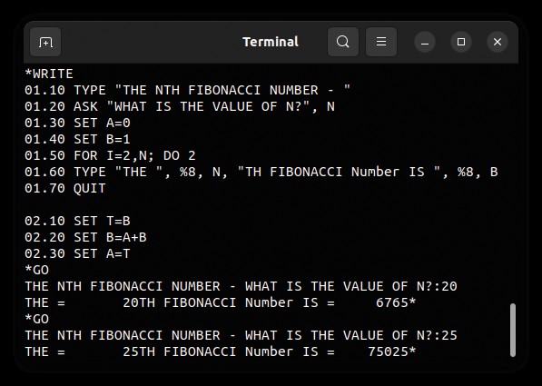 Like the original BASIC, FOCAL was an interpreted language, which included its own IDE, although it was very different from what most people would think of as an IDE today. This was due, in no small part, to the fact that FOCAL would mostly have been run on a hardcopy terminal such as a teletype, instead of a display screen. Under Linux, it runs in a terminal window, which is as close as most of us can get to using a teletype terminal. Instructions can either be entered without a line number, in which case they are executed immediately, or with a line number, in which case they’re stored as part of a program for subsequent execution. See later for more information on line numbers – they’re probably not what you’d expect. To change a line in the program, re-enter it with the same