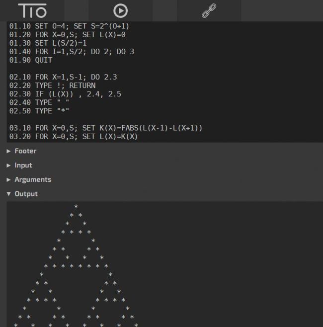 (Try It Online), which offers FOCAL-69 among its 680 languages. Despite it providing a hassle-free solution, it doesn’t fully replicate the original FOCAL experience as it doesn’t implement the complete programming environment that you get with the GitHub Linux version. Instead, you use TIO’s common interface for entering and editing your code. Furthermore, in our experience, the ASK statement doesn’t seem to work, and we encountered other glitches.
