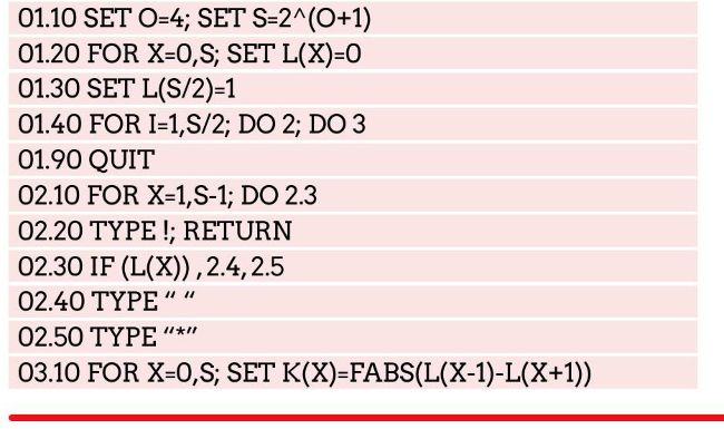 Next up is the IF statement, and this is probably quite different from what you’re used to, because FOCAL doesn’t have the usual relational operators such as equal, greater, less than and so on. In fact, FOCAL’s IF statement has more than a little in common with a processor’s underlying instructions, and hence assembler programming. This seems rather strange for a beginners’ language, especially when we bear in mind that BASIC and other popular languages that preceded FOCAL, such as FORTRAN and Algol, did have relational operators. FOCAL’s IF statement includes a variable name or arithmetic expression, which must be enclosed in round brackets, followed by three line numbers representing where execution continues if the expression gives a negative, zero or positive result respectively. As an example, IF (N-5) 01.20, 01.30, 01.40 causes N-5 to be evaluated and then, if the result is negative, the program branches to line 01.20; if it’s zero, it branches to 01.30; and if it’s positive, it branches to 01.40. Actually, it’s not necessary to provide all three line numbers – so, for example, if you don’t want it to test for a negative result, you could use the statement IF (X) , 01.30, 01.40 .