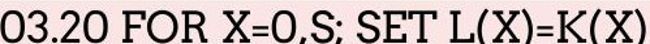 Something else we’ve not seen before is the FABS function, which appears in line 03.10, and which returns the absolute value of its argument. The other available functions are FSQT , FSGN , FITR , FRAN , FEXP , FSIN , FCOS , FATN and FLOG , and these return the square root, sign (-1 for a negative number, +1 for a positive number or zero), integer part, random number, exponential, sine, cosine, arc tangent and natural logarithm, respectively.
