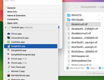 > Choose the app you want to open Rich Text files. Pick that from the list when you select a file; open Get Info (Cmd+I) then, to set it as the default from the ‘Open with:’ menu, click on Change All.