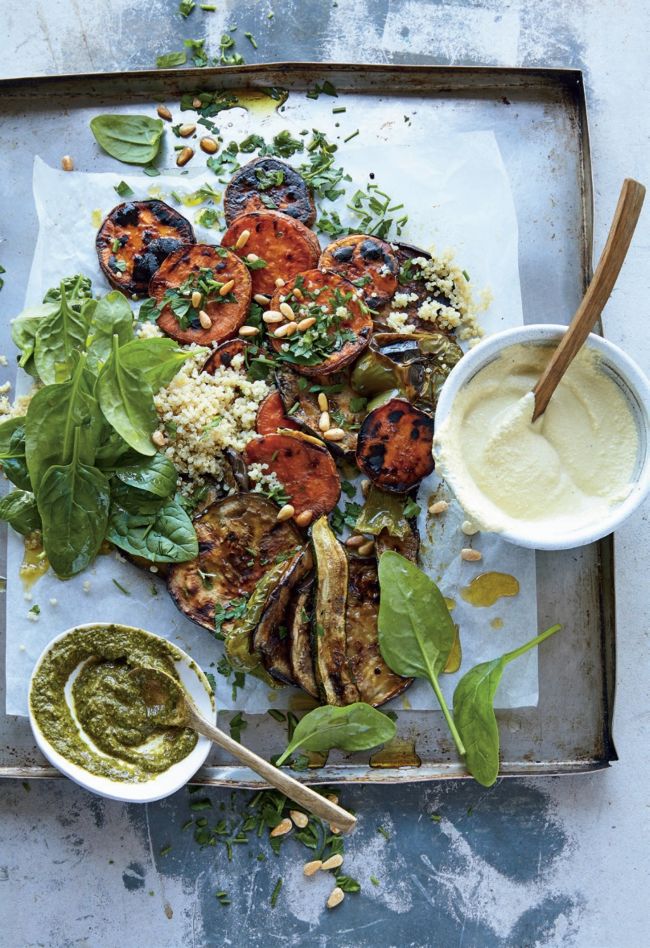 CHARGRILLED VEGETABLE SALAD WITH QUINOA, PESTO AND CHEESY SAUCE