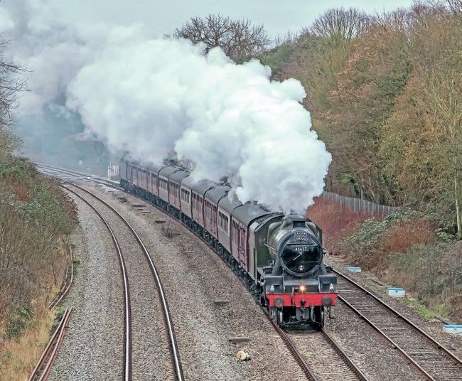 STEAMING THROUGH GLOUCESTERSHIRE: Masquerading as No. 45627 Sierra Leone, LMS ‘Jubilee’ 4-6-0 No. 45699 Galatea accelerates past Haresfield Loop on the last stretch to its destination on February 4, hauling 1Z32 from London Paddington to Gloucester with the Railway Touring Company’s ‘Bath & Gloucester Steam Express’. West Coast Railways Class 47 No. 47802 is just visible on the rear of the