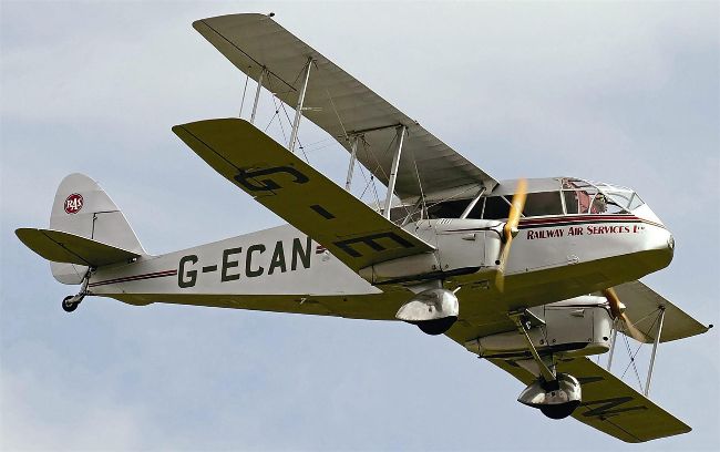 This twin-engined de Havilland DH84 Dragon was actually built in Australia for the RAAF in 1943, but later converted to civilian standard. After it was imported to the UK, it was given this retro 1930s look as Railway Air Services G-ECAN and pictured flying over Duxford (Cambridgeshire) on July 9, 2011.