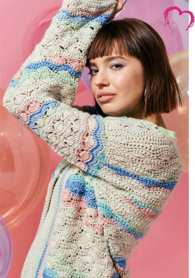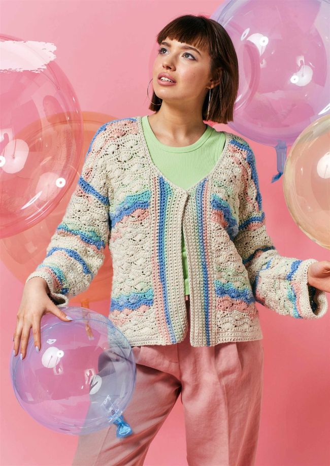 This lightweight cardigan uses different stitches and techniques to create striped effects with variegated yarn.