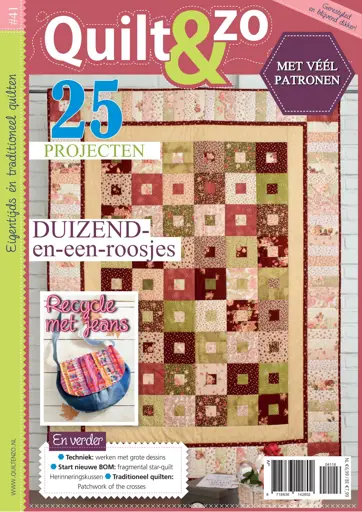 Aan de slag met een nieuwe BOM in Quilt & Zo 41. In Quilt & Zo 41 introduceren we de nieuwe BOM, waar we de komende 4 uitgaven mee aan de slag gaan. Verder zijn bladeren, bloemen en herfsttinten belangrijke elementen die in deze uitgave terugkomen. Dat dit in zowel in een klassieke ‘look’, zoals grootmoeders bloementuin, kan als de moderne en kleurrijke quilt met klaprozen laten we je volop zien. Naast quilts zijn er ook andere leuke stofprojecten, zoals de sleuteltasjes die stap-voor-stap worden uitgelegd, de Flowerpower riem en een Indian Summer jeanstas. Natuurlijk is er nog veel meer in dit magazine om van te genieten, zoals de column van Nienke Smit, waarin zij vertelt over het verfvirus en ijsverven, en lees je meer over het jubileum van Cordi Atelier. De redactie wenst je heel veel doe- en leesplezier!
