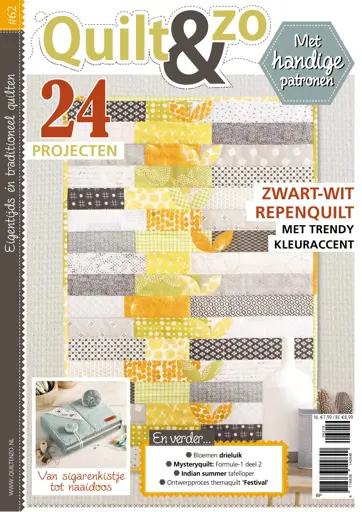In deze nieuwe editie van Quilt & Zo vind je veel variatie. Zo maak je een deken met letters, handige tassen en vrolijke kussens. Natuurlijk vind je ook een paar prachtige quilts voor aan de muur. Een genot om naar te kijken! Het derde deel van de seizoenskalender vind je ook in deze uitgave, helemaal in het thema van de herfst. En het tweede deel van de Mystery Formule-1 serie wil je natuurlijk zeker niet missen!