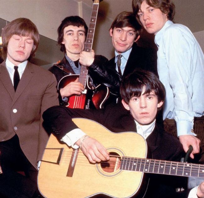 All the guitar players used to gather in the boys’ cloakroom at Sidcup Art School. Keith would usually sit right at the end by the window, with his little archtop guitar. He was fixated on Scotty Moore and one of his things he always used to play was “I’m Left, You’re Right, She’s Gone” and sometimes “That’s All Right Mama”. Keith and I clicked rather well, I liked him a lot. He had a very unique sense of style: skinny jeans, purple shirt, Wrangler jean jacket. I think he had a whole wardrobe of purple shirts. He knew I was in this band with Mick, but was a little reticent to ask if he could come along. Keith’s mum said that he was actually too shy to ask. I don’t think it was that, but he certainly wasn’t some big, expansive character. Then Keith and Mick met up and, when the conversation about rehearsals came up, Mick said, “Why doesn’t Keith come along?” That’s kind of how it happened. He was anatural guitar player. He didn’t have super technique, but it just seemed like Keith had areal flair for it.