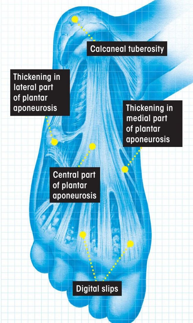 The plantar fascia is a band of fi brous tissue that extends from the heel bone to the metatarsal bones (ball of foot). It’s a really key area for runners because it supports the arch and takes a lot of load during walking and running.