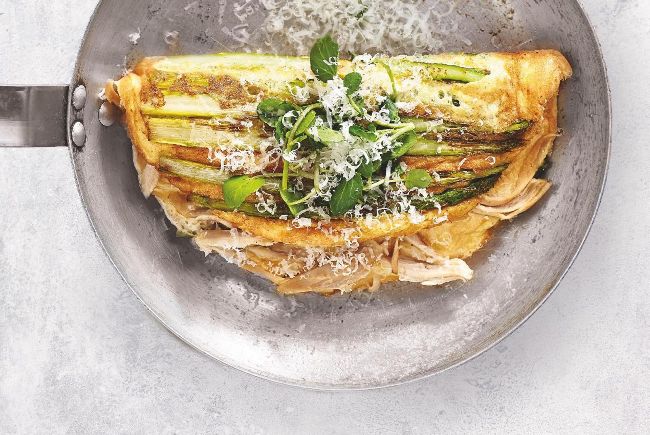 • ½ bunch asparagus (about 200g) • 3 medium free-range eggs, separated • 10g parmesan, finely grated, plus extra to serve • 15g unsalted butter • 70g leftover roast chicken, shredded • 20g gruyère or extra-mature cheddar, finely grated • Watercress to serve (optional