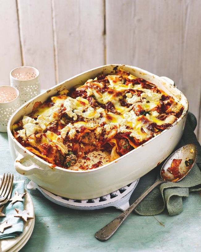 Traditionally, this rich Neapolitan lasagne is made on special occasions. When I was growing up in Italy, the family would gather at my grandfather’s house and we’d eat it for lunch on Christmas Eve. It was made the day before, usually as a joint effort among the women in our household: my mother made the fresh pasta sheets, my Aunt Maria the tomato sauce and my sisters the meatballs. Other ingredients were also often added: mushrooms, grilled vegetables and whatever else was around and in season. This is my simplified version, which I still make today, especially when I’m expecting guests at Christmastime.